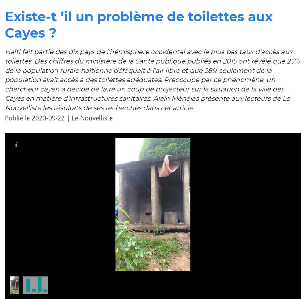 Based on the presence of individuals defecating on the beaches of les Cayes and the mayoral candidate (Fortuné) assertion that all latrines should be replaced with flushing toilets, I set out to find if there is a toilet problem in the city of les Cayes. For this paper, I conducted a survey in the city of les Cayes in august 2020, proceeded to observe the count and proportion data, created a bar graph for counts of the types of toilets available and ran a hypothesis test on the proportion of flushing toilets in the general population. I also created a bar graph and observed the count and proportion data before I created a hypothesis test on the proportion of the population with no access to toilets. Finally, I created a histogram for the number of people living in a household and calculated the mean. I also conducted a hypothesis test for the mean number of people in each household. I came to the conclusion that about 41% of the population of les Cayes have access to flushing toilets. Through further hypothesis testing, I am able to say that about 95% of the population in les Cayes have no access to toilets at all. Finally, through the hypothesis testing, I am 95% confident that the true number of people composing a household in Les Cayes is between 4 and 5 (4.67).